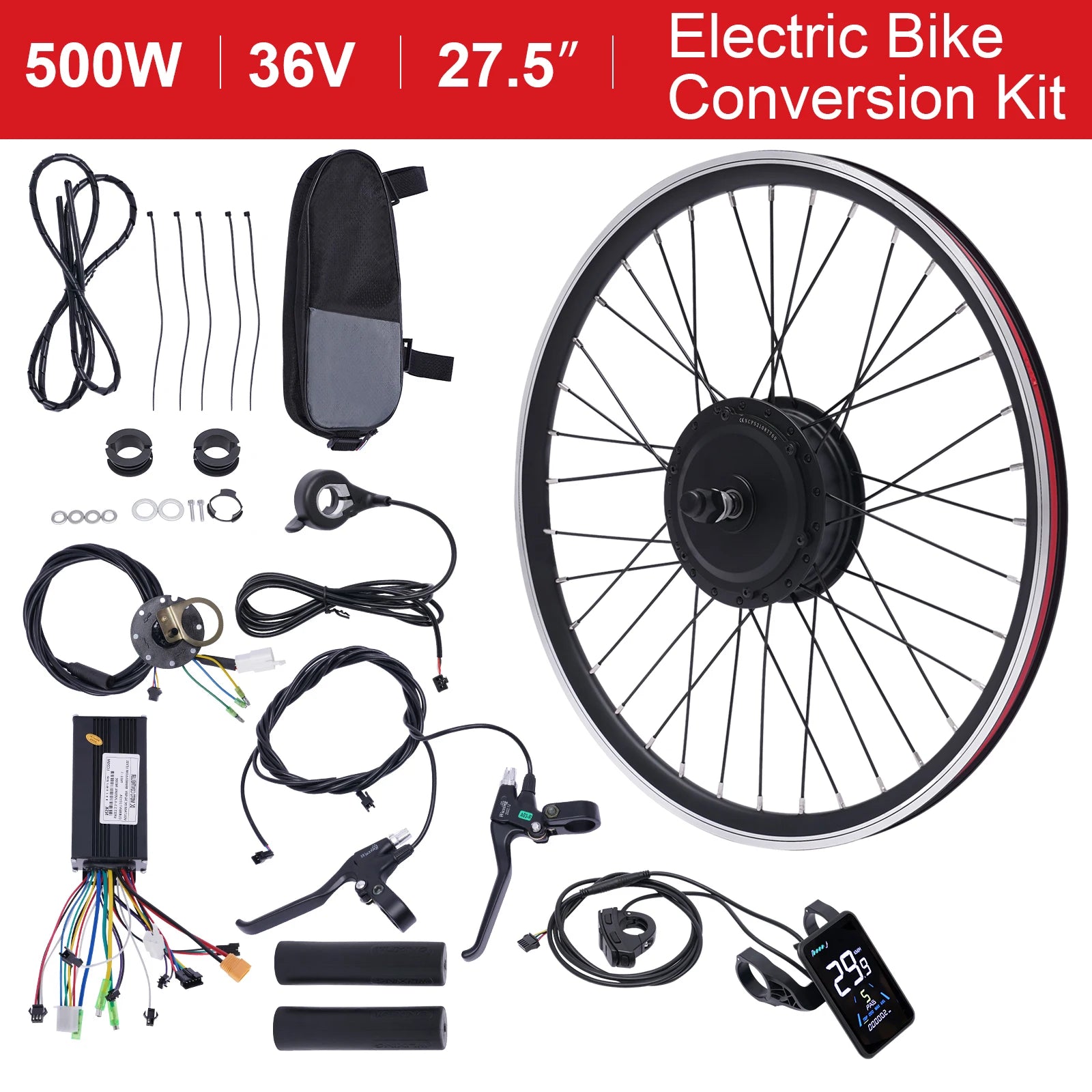 36V 500W Electric Bike Conversion Kit with LCD Display PAS Brake Levers Complete E-Bike Kit for 27.5"/700C Front Wheel